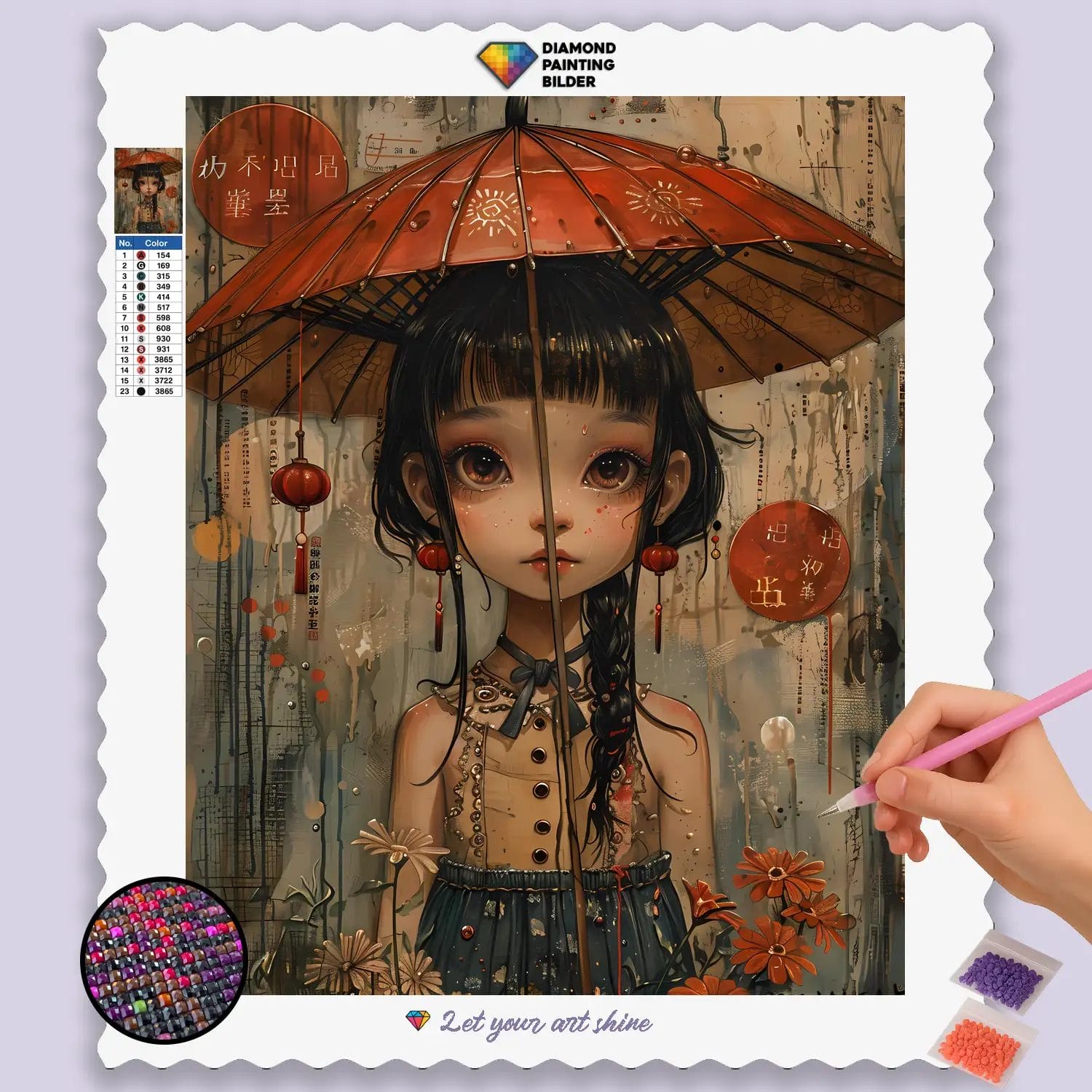 Tauchen Sie ein in eine Welt voller Niedlichkeit und charmantem Wetter mit unserem bezaubernden Diamond Painting „Chibi mit Regenschirm“! Dieses liebenswerte Motiv fängt die skurrile Seite eines Chibi-Charakters ein, der fröhlich oder nachdenklich mit einem bunten Regenschirm spaziert, vielleicht im Regen oder einfach nur als Accessoire. Der einzigartige Chibi-Stil mit seinen kleinen Proportionen und übertriebenen Merkmalen verleiht dem Bild eine unwiderstehliche Süße. Jeder glitzernde Stein hilft Ihnen, die lebendigen Farben des Regenschirms, die charmanten Gesichtszüge des Chibi und die gemütliche oder verspielte Atmosphäre zum Leben zu erwecken. Es ist eine Hommage an die Freude, die man auch an Regentagen finden kann, an die unschuldige Fantasie und an die Fähigkeit, das Leben mit einem Lächeln zu nehmen. Ein ideales Diamond Painting für alle, die das Chibi-Art lieben und eine Portion strahlenden Optimismus in ihr Zuhause bringen möchten.