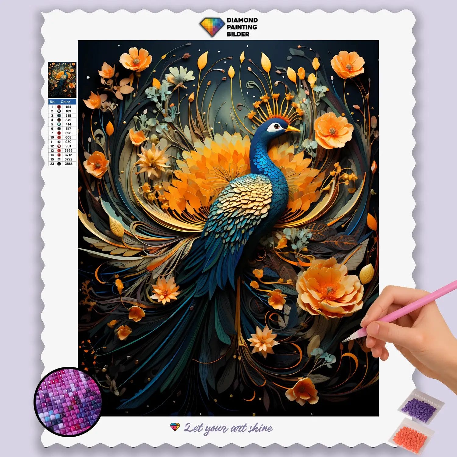 Entdecken Sie eine Symphonie aus Farben und Anmut mit unserem atemberaubenden Diamond Painting „Pfau und Blumen“! Dieses exquisite Motiv fängt die majestätische Schönheit eines Pfaus ein, dessen schillerndes Federkleid sich harmonisch mit einer üppigen Pracht von bunten Blumen verbindet. Jeder glitzernde Stein hilft Ihnen, die leuchtenden Blau- und Grüntöne des Pfaus, seine elegante Haltung und die lebendigen Farben der Blüten zum Leben zu erwecken. Es ist eine Hommage an die exotische Natur, die Pracht der Vögel und die unendliche Vielfalt floraler Designs. Ein ideales Diamond Painting für alle, die sich nach Eleganz, lebendigen Farben und einem Hauch von Exotik in ihrem Zuhause sehnen.