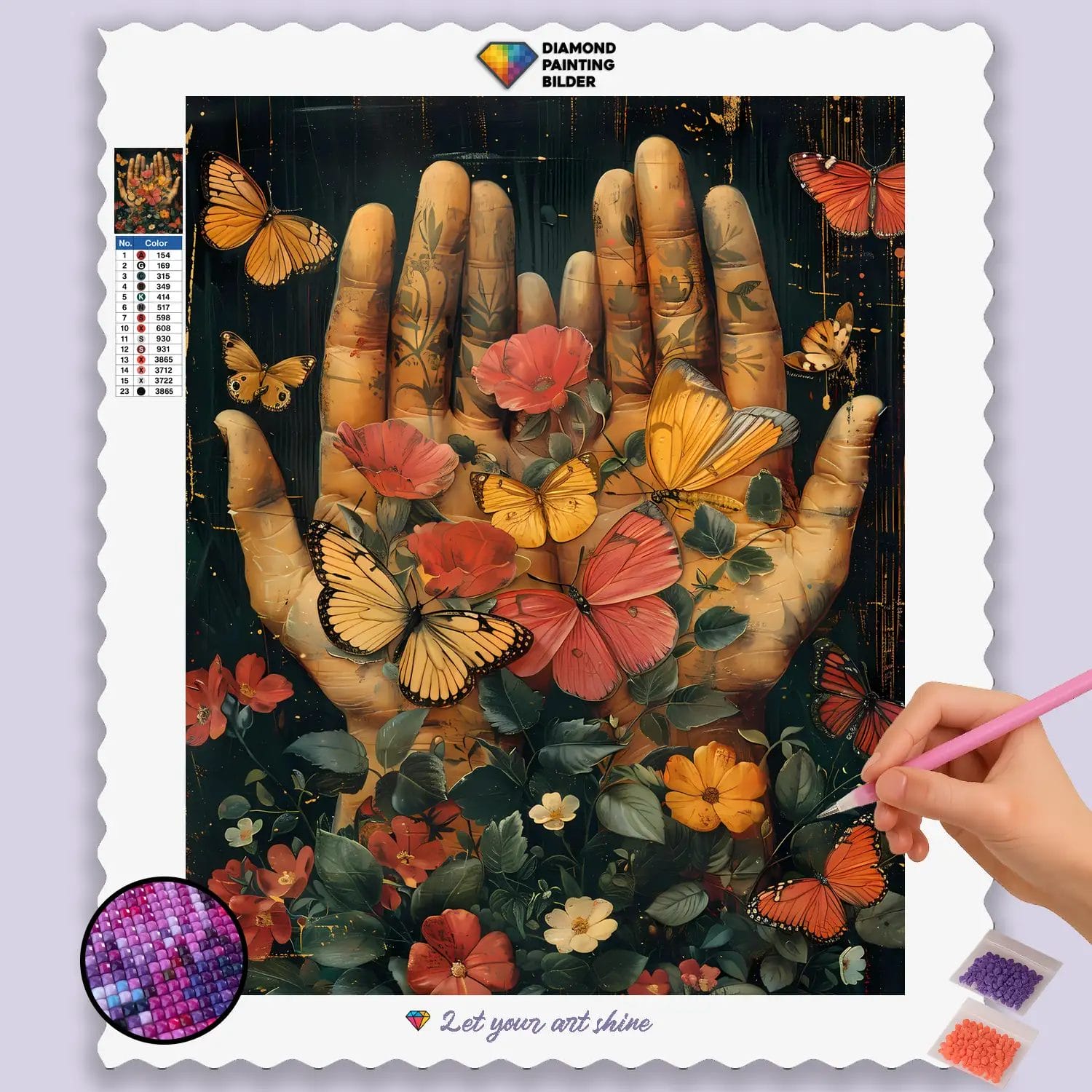 Gestalten Sie ein funkelndes Meisterwerk, das die Seele beflügelt und eine Aura von Lebendigkeit und natürlicher Harmonie schafft. Dieses hochwertige Diamond Painting Set bietet nicht nur eine wunderbar entspannende und kreative Auszeit, sondern auch ein atemberaubendes Ergebnis, das Sie stolz in Ihrem Zuhause präsentieren können. Ob als charmanter Blickfang in jedem Raum, eine inspirierende Ergänzung Ihrer Sammlung oder als perfektes Geschenk für Naturliebhaber, Gärtner und alle, die eine Prise Wunder schätzen – dieses Diamond Painting Bild ist eine fabelhafte Möglichkeit, die Anziehungskraft von Schmetterlingsgärten in einem glänzenden Kunstwerk festzuhalten.